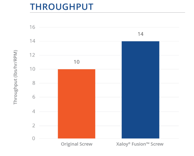 Nosso cliente relatou melhorias imediatas e mensuráveis após a instalação da rosca Xaloy Fusion®™ . A produtividade aumentou significativamente operando em RPM mais baixa, contribuindo diretamente para maior estabilidade térmica e maior consistência do produto. A atualização resultou em uma melhora de 40% na produção específica, subindo de 10 lbs/h por RPM para 14 lbs/h por RPM.